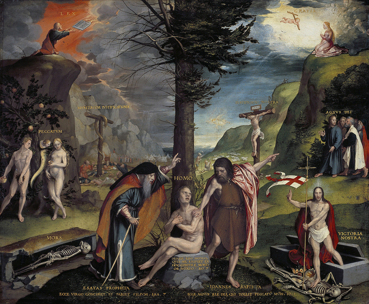 Overarching the picture are the words LEX (signifying the Old Testament based on Law) contrasted with GRATIA (signifying the New Testament based on God's grace).