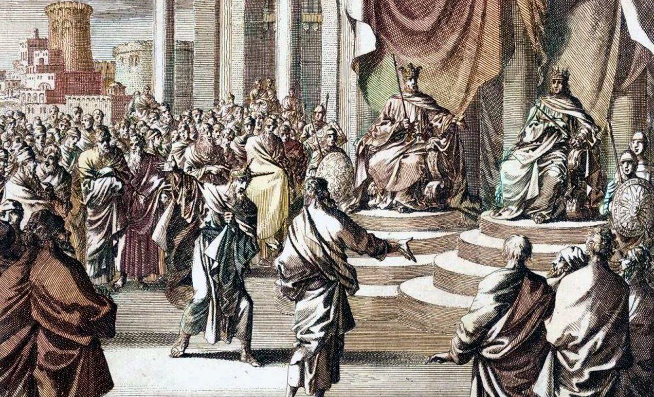 Micaiah and Zedekiah before King Ahab and King Jehoshaphat Engraving of painting by Jan van Luyken, Rijksmuseum, Amsterdam