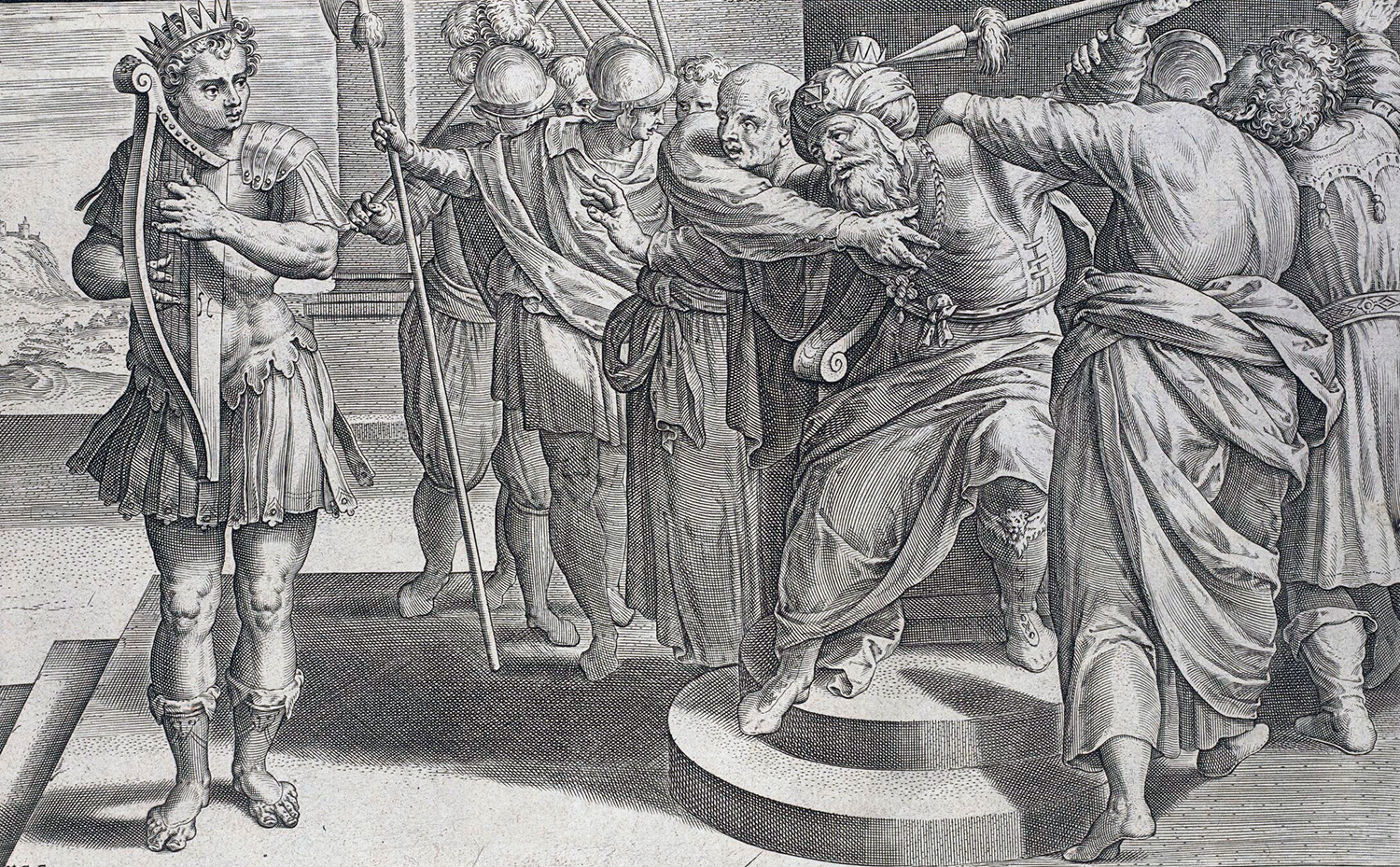 Saul trying to kill David in a fit of rage Engraving of a painting attributed to Ambrosius Francken The Courtauld, London (Samuel Courtauld Trust)